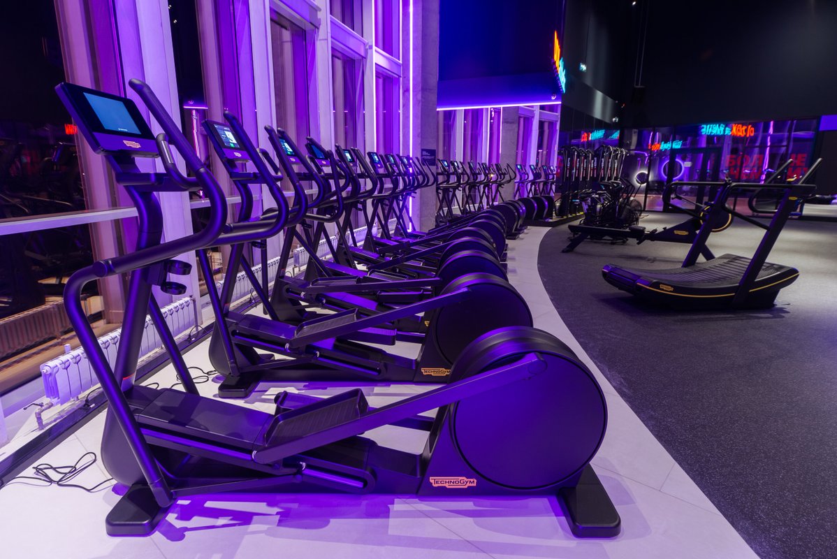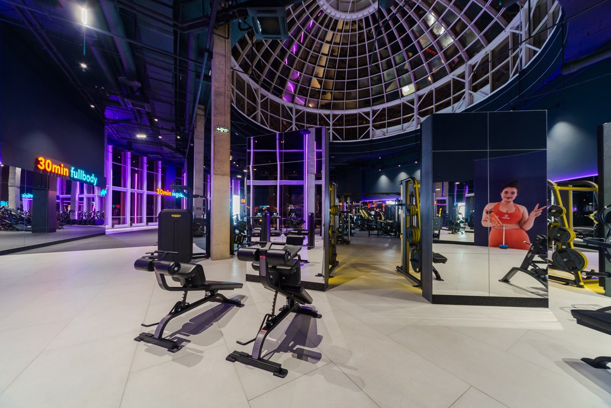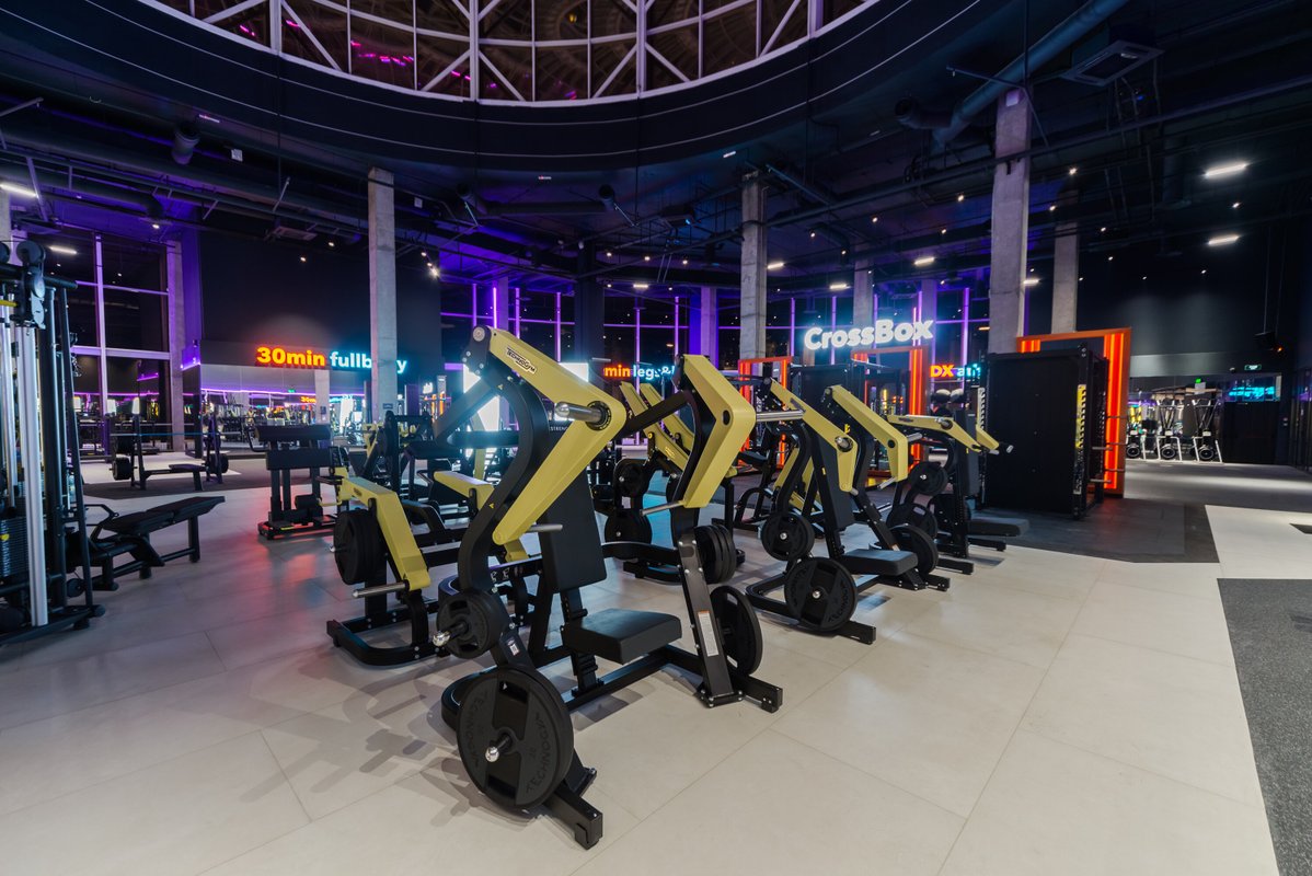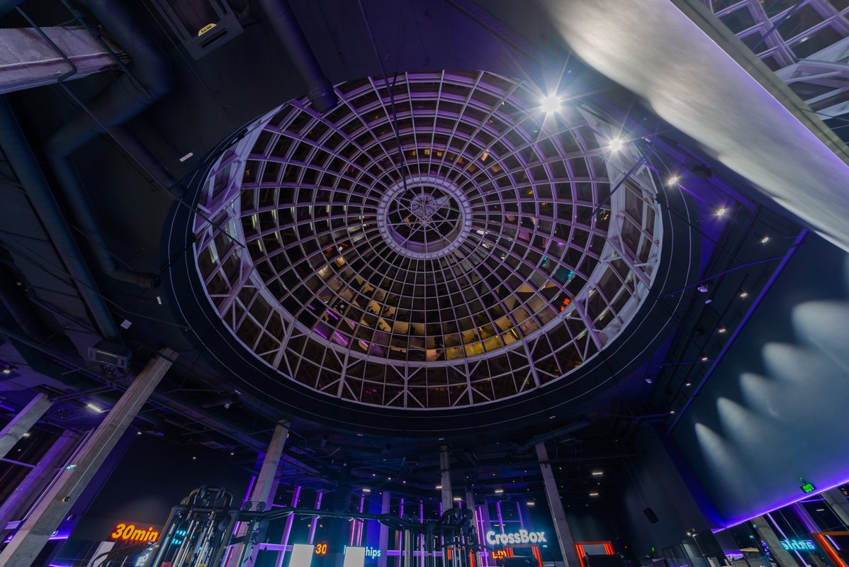 Визуал и состояние тренажеров отличное, не тесно и пока нет очередей. Уникальную атмосферу клубу предают панорамные окна и стеклянная крыша
